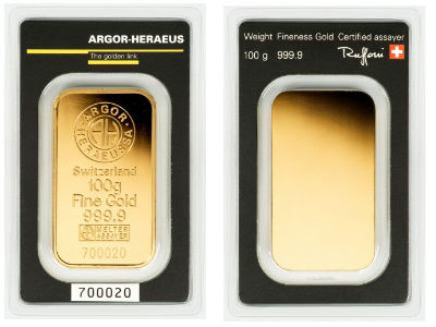 Each Bar is stamped with the Argor Haraeus and inscribed with the gold purity, serial number and weight of the bar. All 100.0 gram Argor Haraeus Gold Bars are shipped in new condition and are always sealed with Assay.