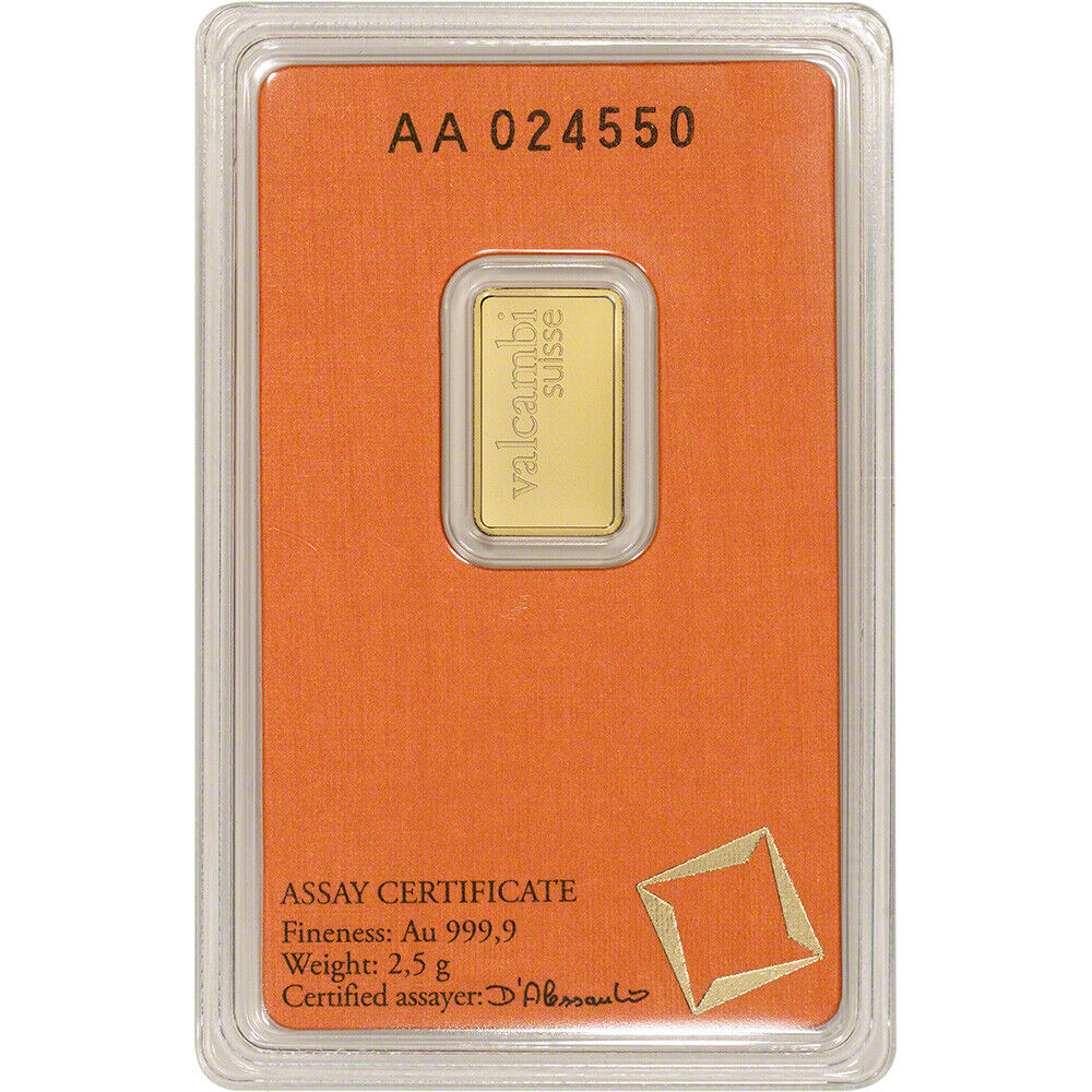 Each Bar is stamped with the Valcambi and inscribed with the gold purity, serial number and weight of the bar. All 2.5 Gram Valcambi Gold Bars are shipped in new condition and are always sealed with Assay.